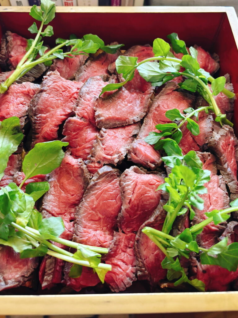 2段目→国産牛ローストビーフ、スタンダードなグレービーソースとクレソン